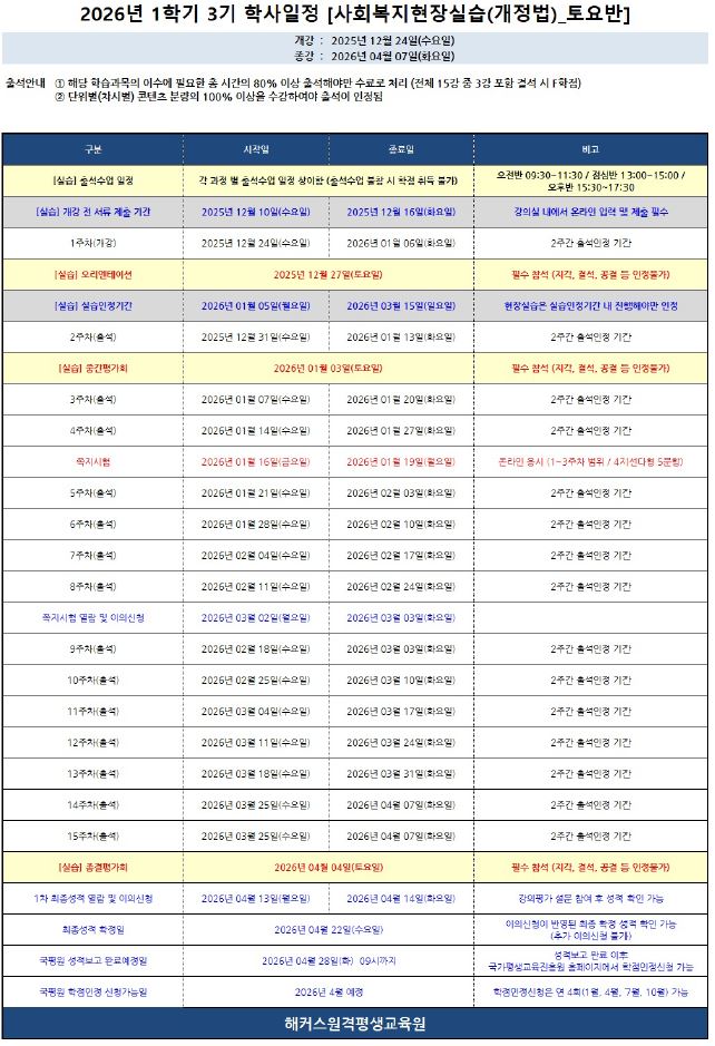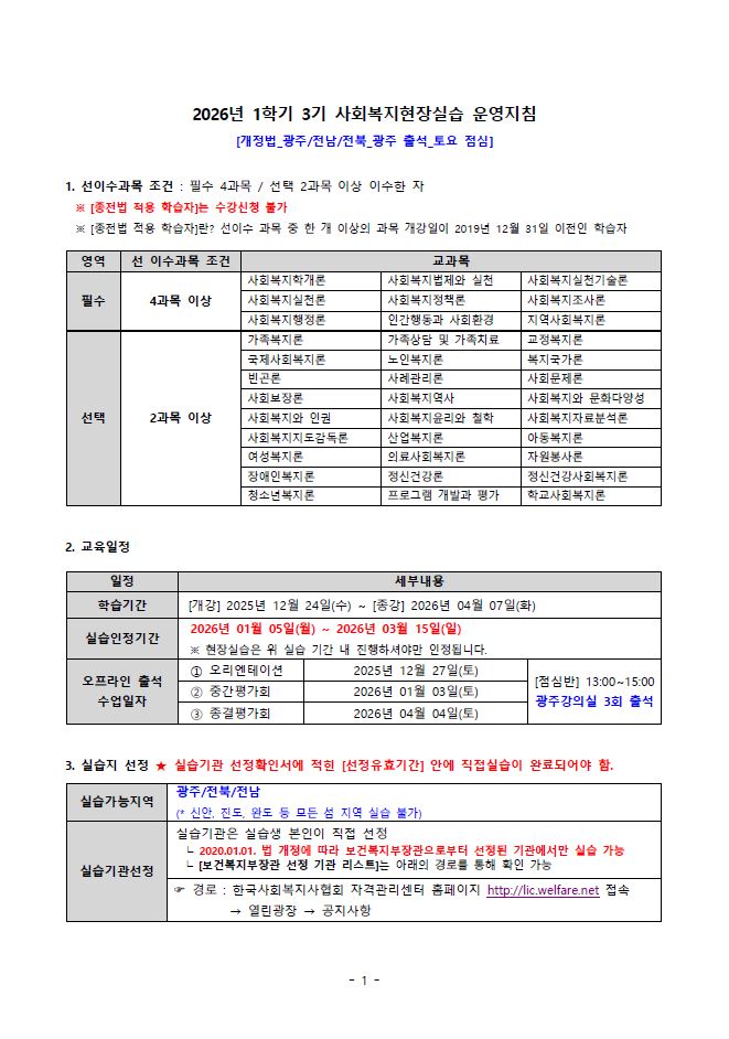 제목 2026년 1학기 3기 (12월 24일 개강반) 사복실습 (개정법_광주/전남/전북_광주출석) 운영지침