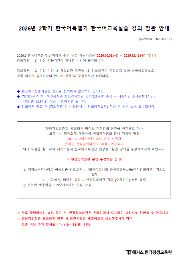 제목 2026년 2학기 한국어특별기 (9월 17일 개강반) 강의참관